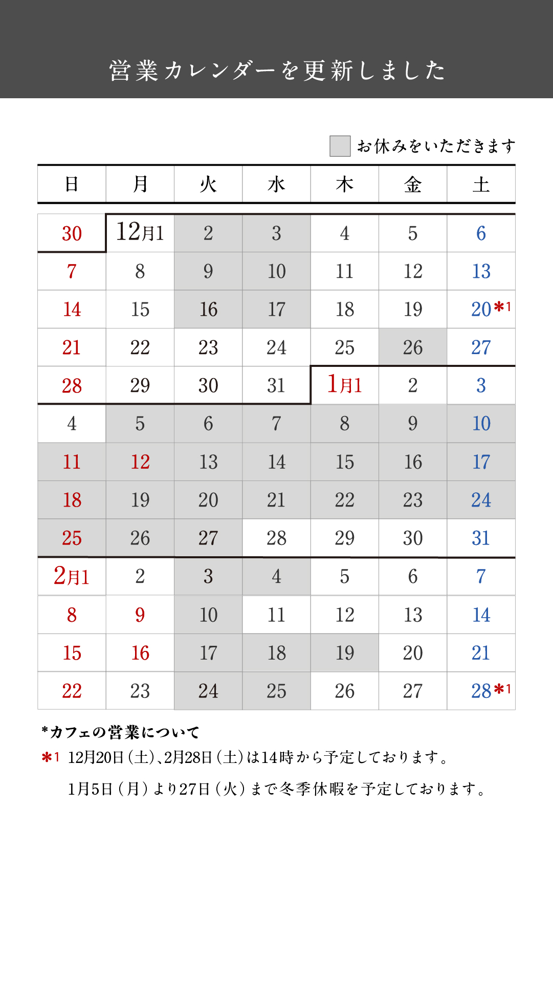 2026年2月末まで、下記の日程にて営業予定とさせていただきます。